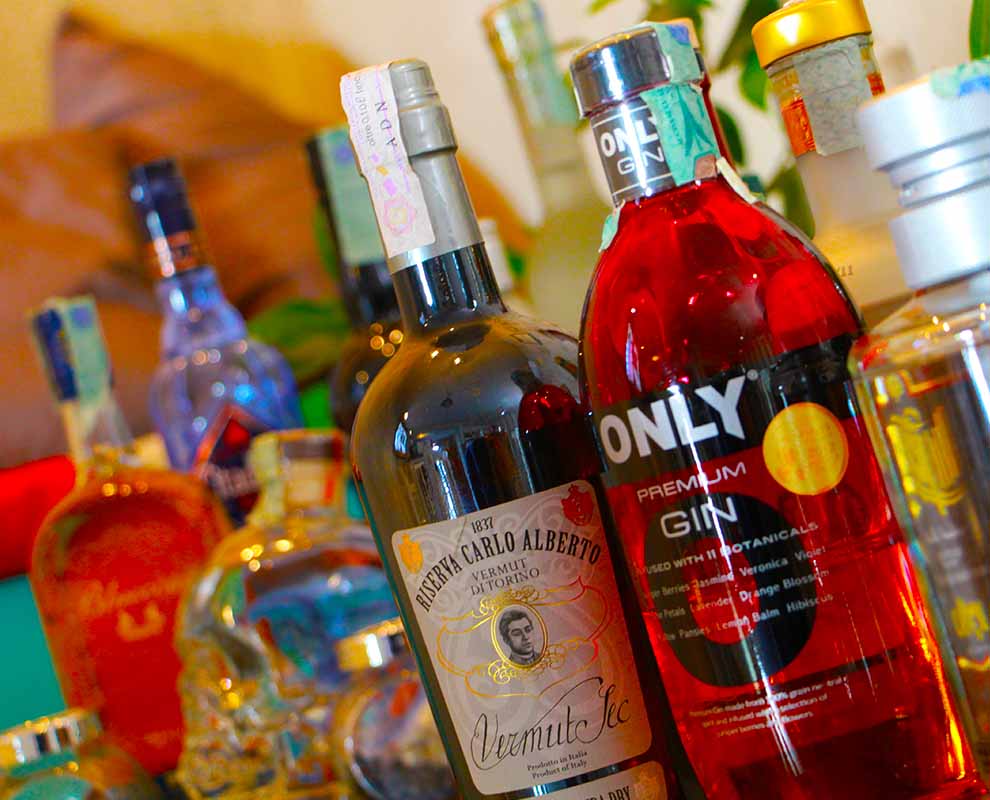 Una lista di liquori di eccellenza: Gin, Ron, Vodka e Vermut, tutti distillati premium per assaporare il gusto della tradizione distillatoria.